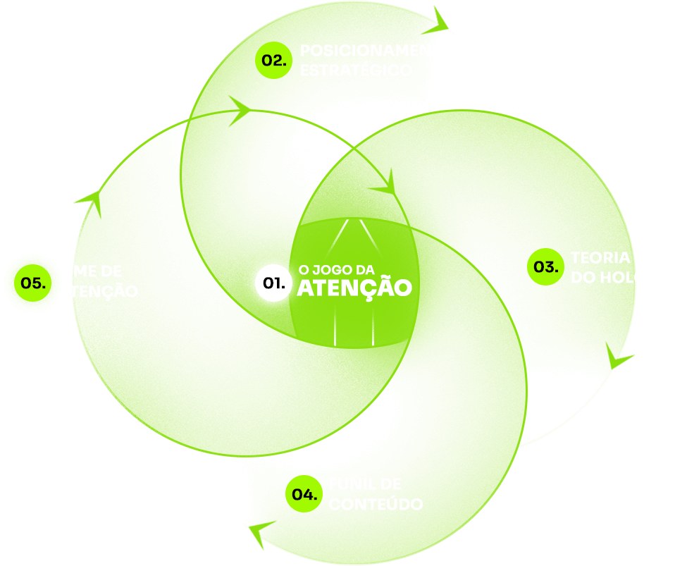 A gente começa atraindo a atenção certa (porque sem atenção, não há vendas), posiciona sua marca com autoridade para que ela seja lembrada (não só vista), direciona o foco pro produto que mais importa com a Teoria do Holofote, estrutura um funil de conteúdo que guia o cliente até a compra, e te ensina como montar um Time de Atenção com foco em resultados e conversão.
